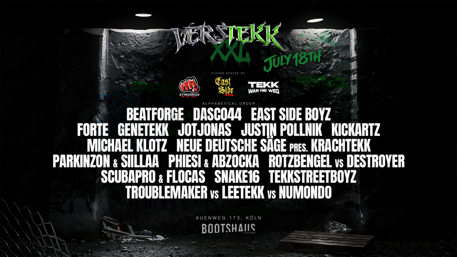 FULL LINE-UP: Beatforge, Dasco44, East Side Boyz, Forte, Genetekk, JotJonas, Justin Pollnik, Kickartz, Michael Klotz, Neue Deutsche Säge pres. Krachtekk, Parkinzon & Siillaa, Phiesi & Abzocka, Rotzbengel vs Destroyer, Scubapro & Flocas, Snake16, Tekkstreetboyz, Troublemaker vs Leetekk vs Numendo